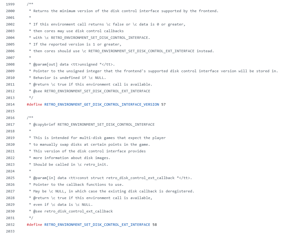 That’s two ways to read input, one way to send a video frame, two ways to send audio, and one to do “environment” work. What’s happened to support all other needs (get directories, console reset, ask about microphone presence, etc) is an extension of the set_environment() function to cover everything else. The function takes a number (#define) and then a void * to the rest of the parameters for that type. So, for example, set_environment(RETRO_ENVIRONMENT_SET_MESSAGE, “hello”) tells the frontend to show “hello” on-screen for a time, while set_environment(RETRO_ENVIRONMENT_SET_NETPACKET_INTERFACE, &retro_netpacket_callback) gives the core the ability to talk to the network somehow (?) Originally meant for reading / setting options, it becomes the majority of the API.