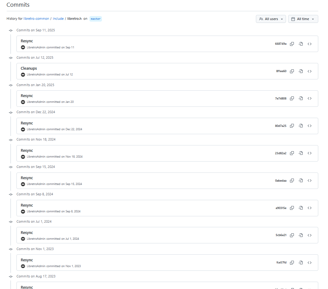 Commit history for libretro.h, of which almost every commit simply says “Resync” in the message